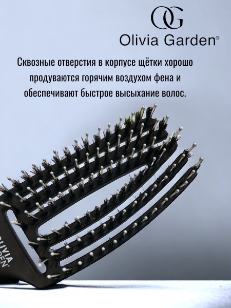 Комбинация **натуральной щетины кабана** и ионизированных нейлоновых штифтов с мягкими наконечниками делает волосы невероятно гладкими и шелковистыми. Отрицательно заряженные ионы снимают статику, закрывают кутикулу и возвращают волосам здоровый природный блеск.