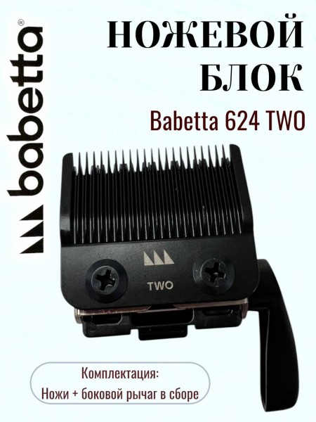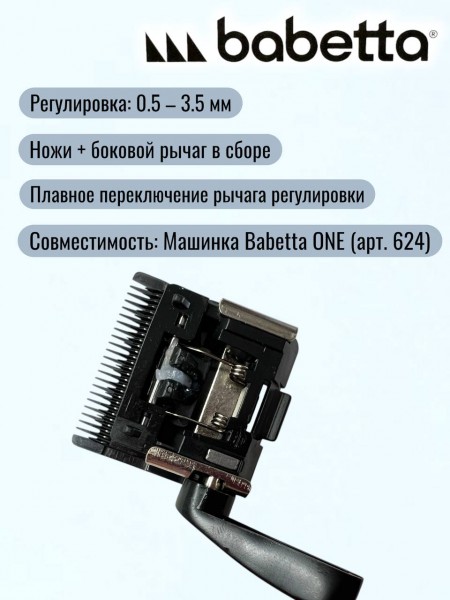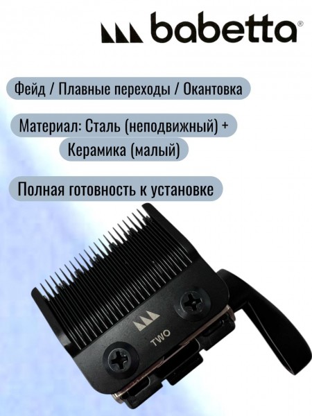 Ножевой блок **Babetta 624 TWO** — это инновационное сочетание материалов для ювелирной точности. Тонкий профиль ножа разработан специально для создания дымчатых переходов (фейда) и окантовочных работ. Комбинация неподвижного стального ножа и подвижного **керамического лезвия** позволяет блоку нагреваться на 75% меньше, сохраняя остроту в разы дольше стальных аналогов. Поставляется в полном сборе с боковой лапкой регулировки.